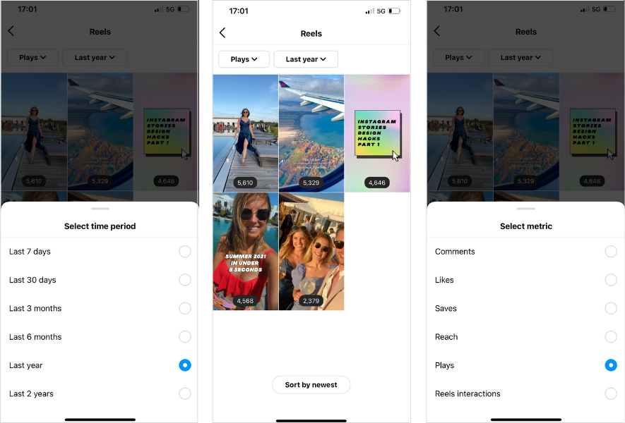 While Instagram Reels analytics are a fairly new addition to the Insights tab, you can still view important metrics such as Comments, Likes, Saves, Reach, Plays, and Interactions.